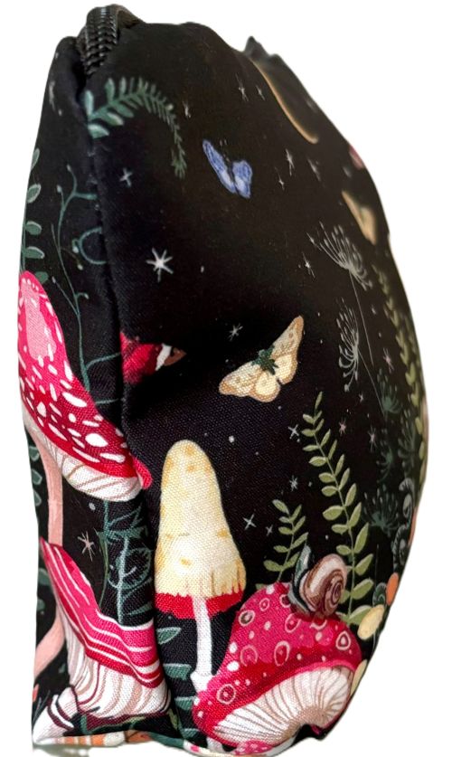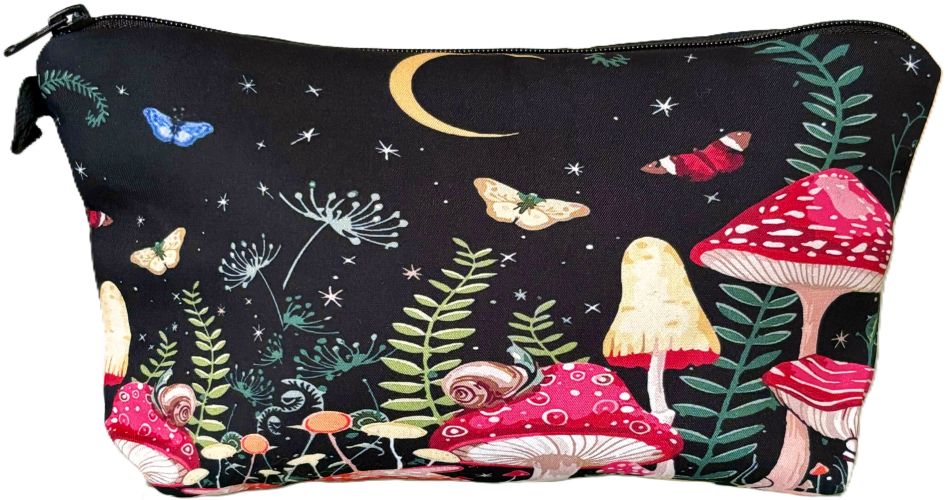 This zippered pouch features a whimsical design of a forest at night. The forest is quite alive with colorful mushrooms, moths, flying dandelion seeds and more. The magic is all around in this enchanting design! Whether you're looking for a beautiful cosmetics pouch or a trendy accessory to carry your essentials, this bag has got you covered.