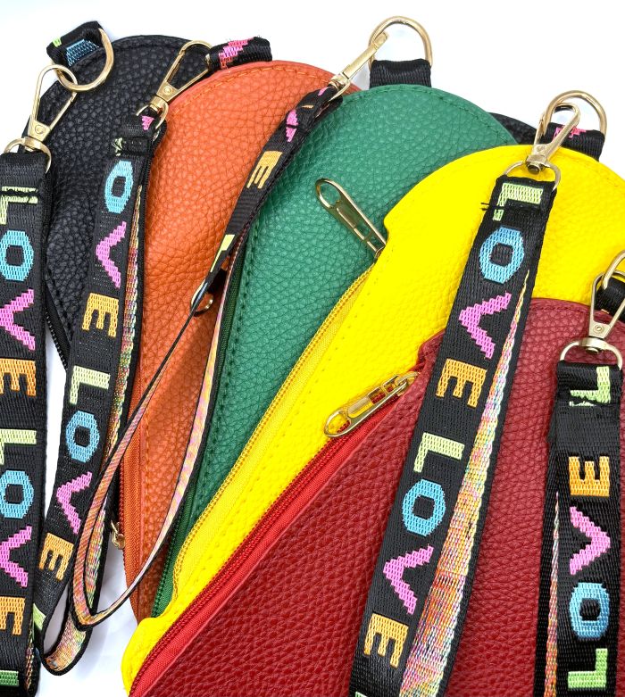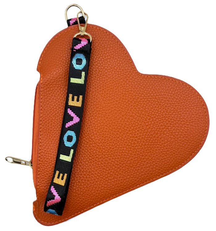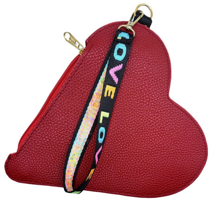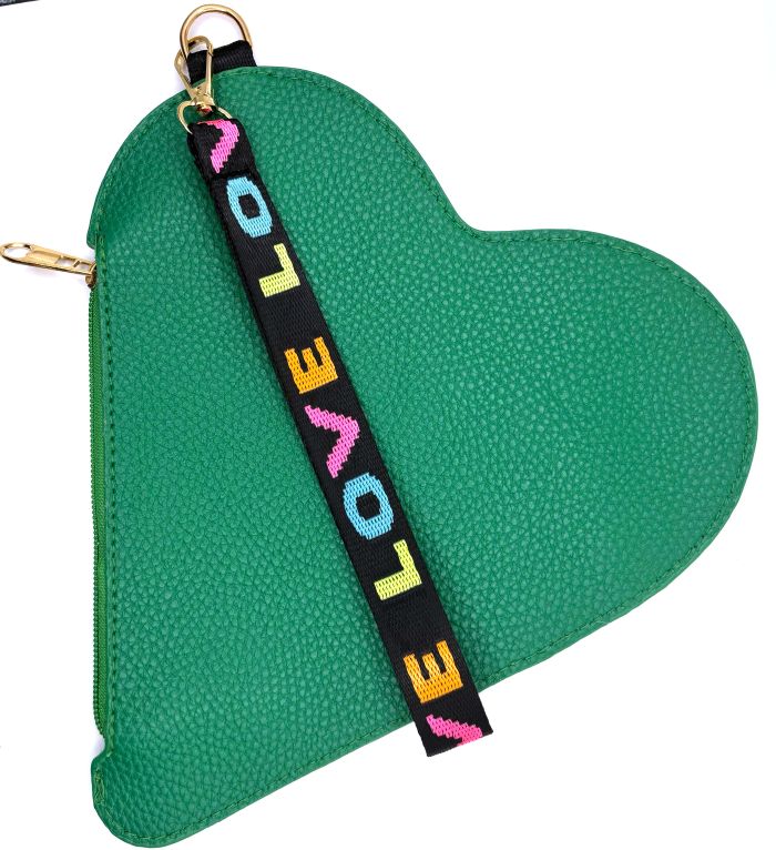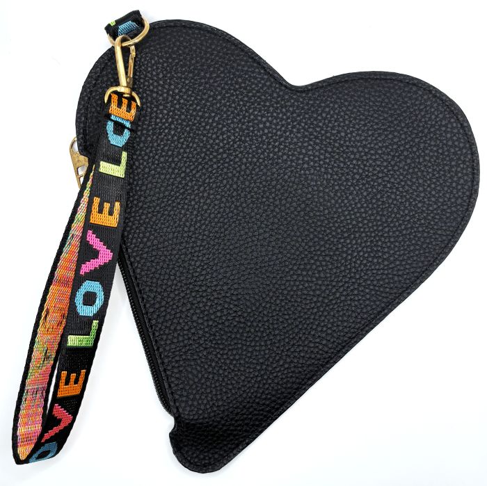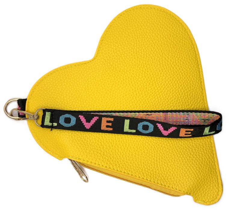 This heart-shaped clutch/wristlet is perfect for anyone who loves a playful, vibrant style - not just for kids! Available in five lively colors - black, orange, green, red, and yellow. Use it as a clutch or wristlet with its detachable strap, which measures approx. 9 1/4"L x 3/4"W. It's adorned with the word "Love" repeating in bold and bright letters. This fun heart bag comfortably holds your essentials like phone, cards, keys, compact, and lipstick. Embrace the fun, retro 80's vibe with this eye-catching accessory that adds a pop of personality to any outfit.