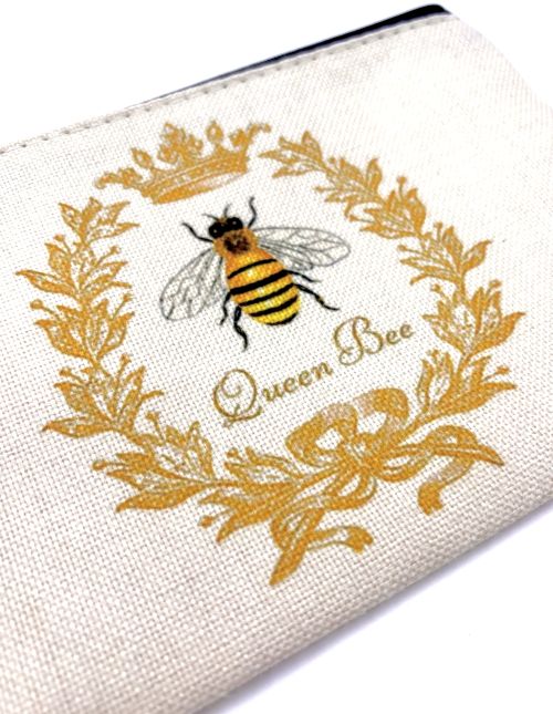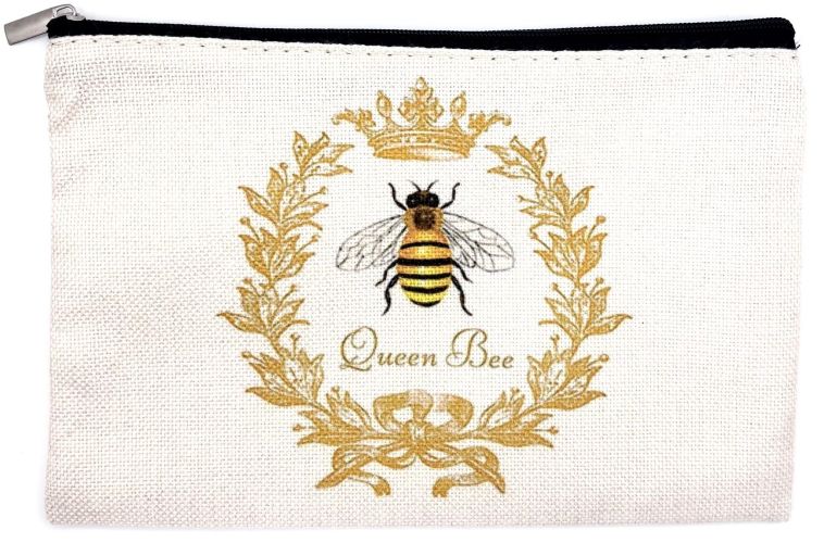 This zippered pouch features a charming design with effortless elegance. A lovely bee with "Queen Bee" written below in cursive is encircled by a golden yellow leaf wreath accented with a crown at the top and a bow at the bottom. This gorgeous design is on both sides.