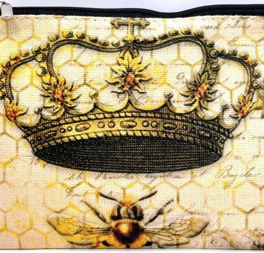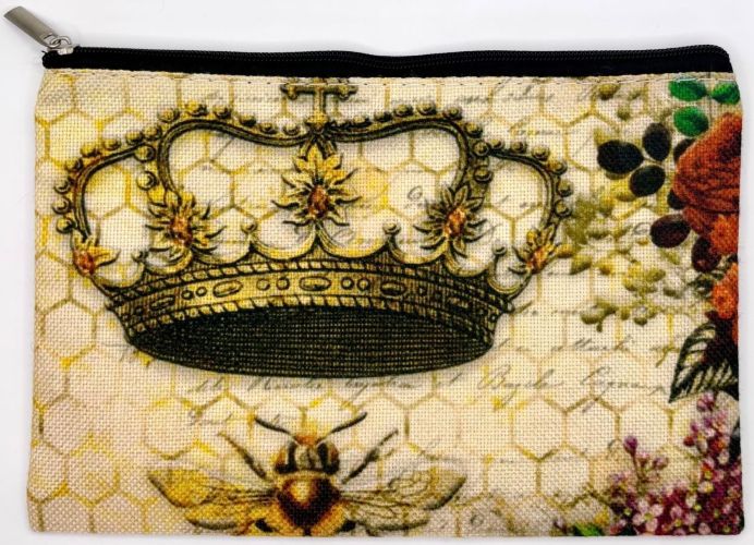 This zippered pouch features a royally fabulous design. Vintage and romantic in style, a bee sits underneath a large ornately designed crown. Red rose floral detailing accents the right side. This gorgeous design is on both sides.