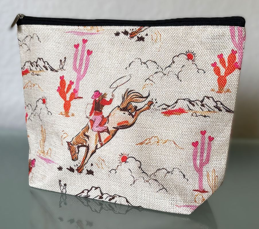 This Western Cowgirl Zippered Pouch captures the spirit of the open range with a striking design of a woman on horseback wielding a lasso, embodying strength and adventure. The vibrant pink and orange cacti, blooming with heart-shaped flowers, bring a lively and whimsical touch that adds a great 'pop' of color. Detailed line drawings of mountain ranges add depth and a sense of vast landscapes to the design. Practical yet stylish, this pouch is perfect for organizing your small items, making it an ideal accessory for lovers of Western charm and rugged beauty.