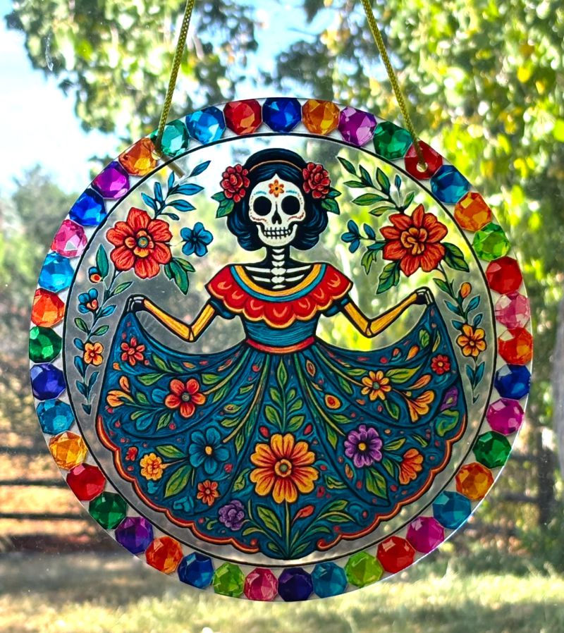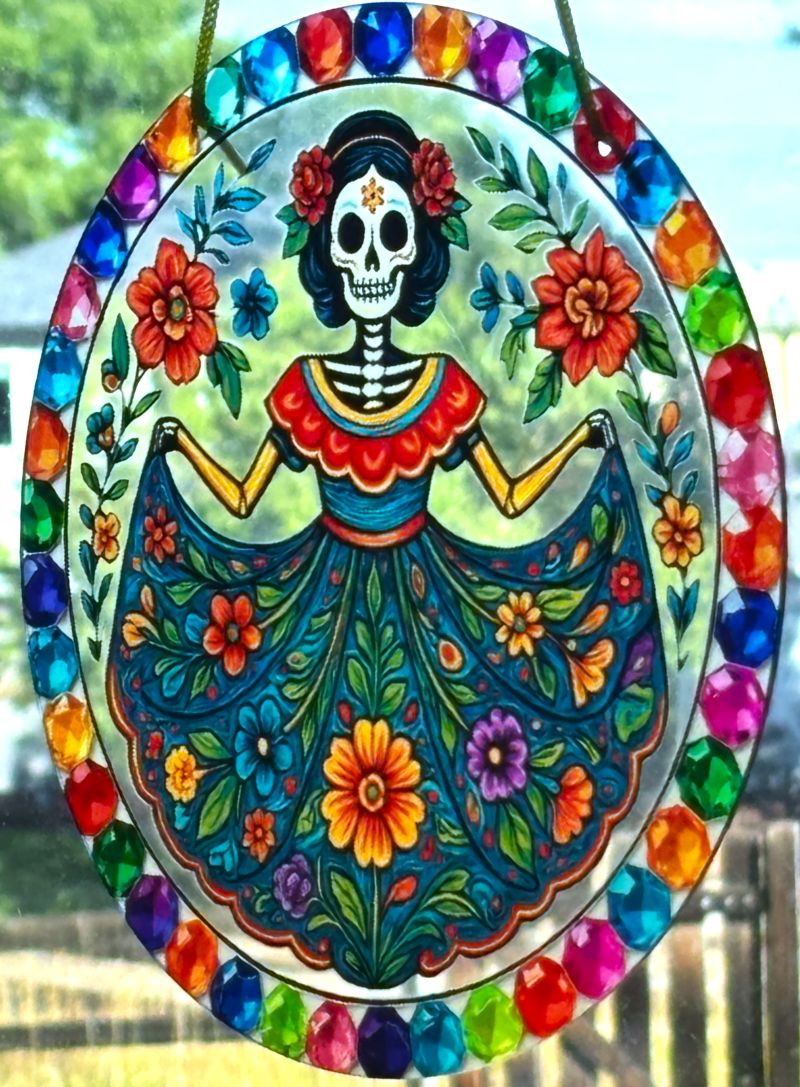 This intricately designed sun catcher highlights the rich Mexican tradition of Dia de los Muertos with a lively dancing female skeleton. She’s dressed in a stunning floral gown adorned with vibrant flowers and more jewel-toned flowers accent the sun catcher. Perfect for adding festive charm to any window, especially for Dia de Los Muertos and Cinco de Mayo celebrations.