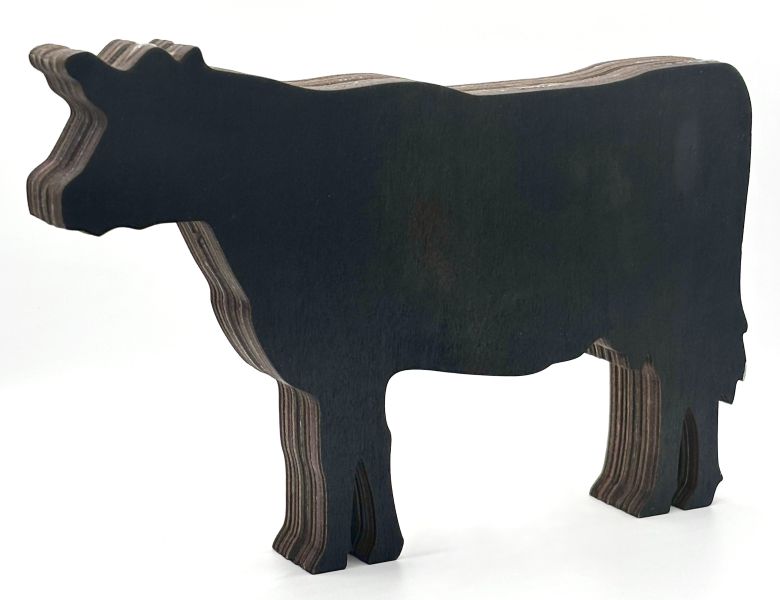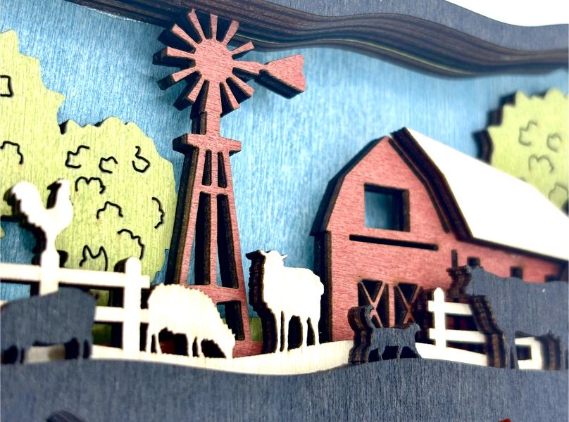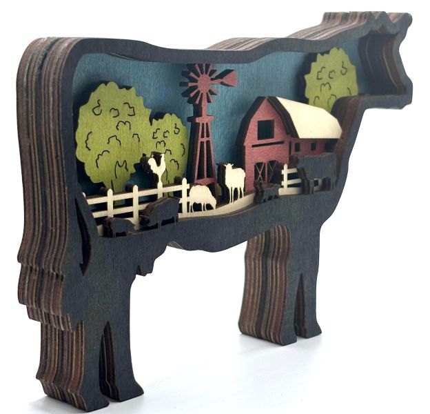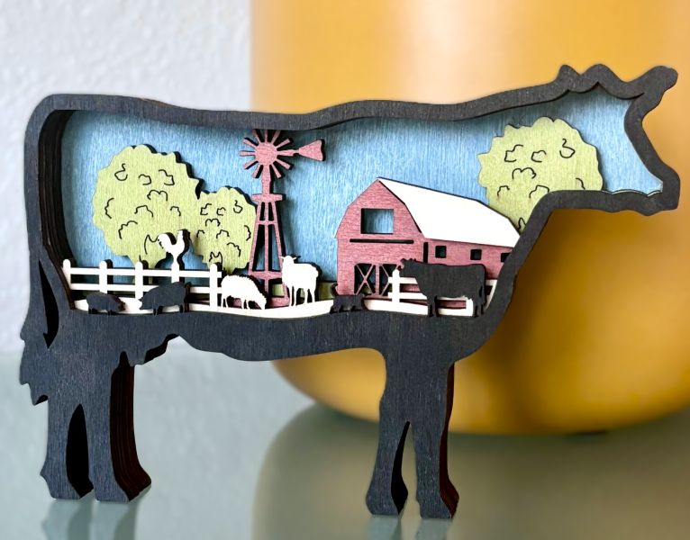 Perfect for farmhouse décor enthusiasts, this 3D wooden diorama showcases a country cow design. Crafted with multiple layers of wood to create the exterior silhouette, the interior reveals laser-cut stained wood elements in natural wood, blue, green, red, and black. The intricate internal scene depicts a pastoral farm complete with livestock, a barn, windmill, and tractor. The cow's exterior is stained black.