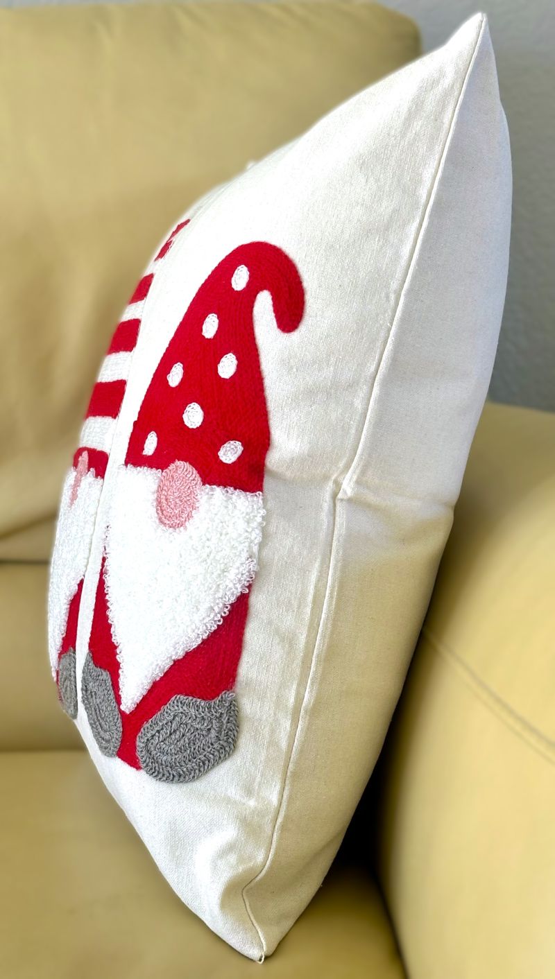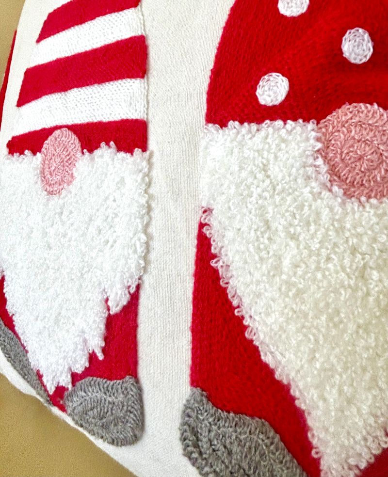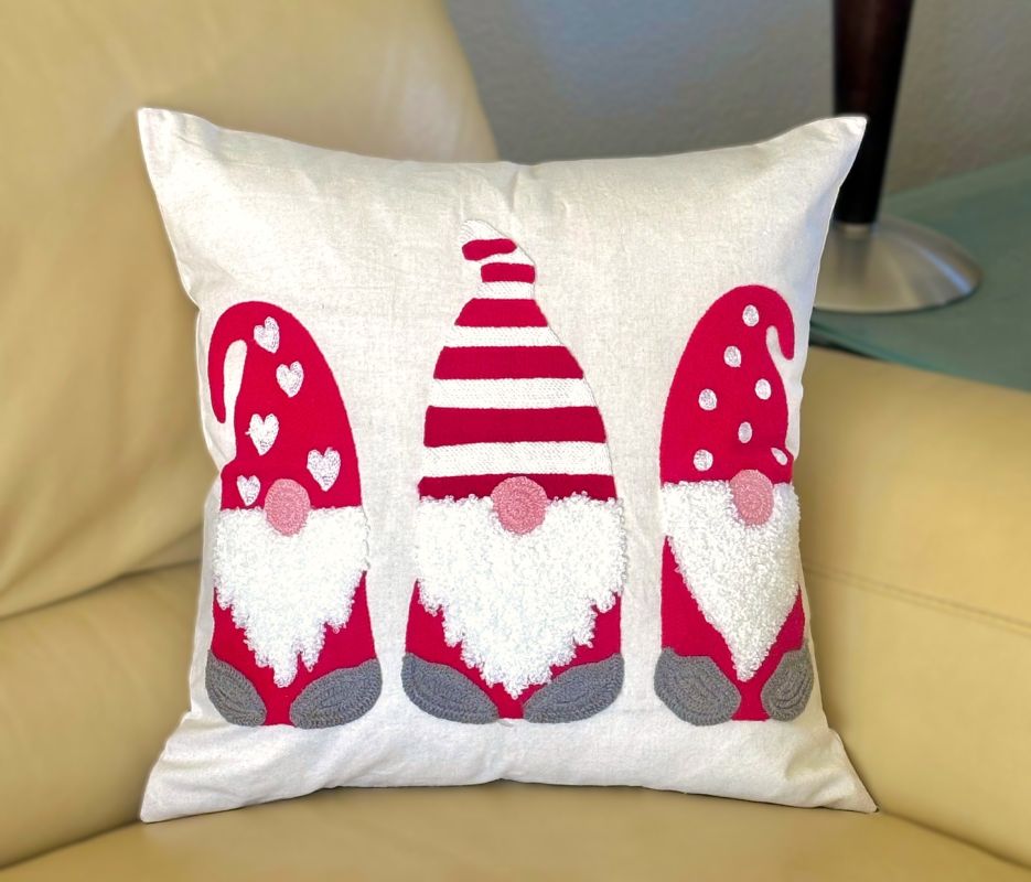 Bring these darling Christmas gnomes into your home this holiday season with our charming embroidered and tufted Christmas throw pillow cover. It features three delightful gnomes in red and white outfits, with each of their festive caps featuring a different pattern; hearts, stripes and polka dots. The gnomes are embroidered and have soft tufted white beards. This pillow cover would even look great displayed around Valentine's Day! Measuring 18" square, this delightful pillow cover is designed to add a touch of whimsical cheer to any room.