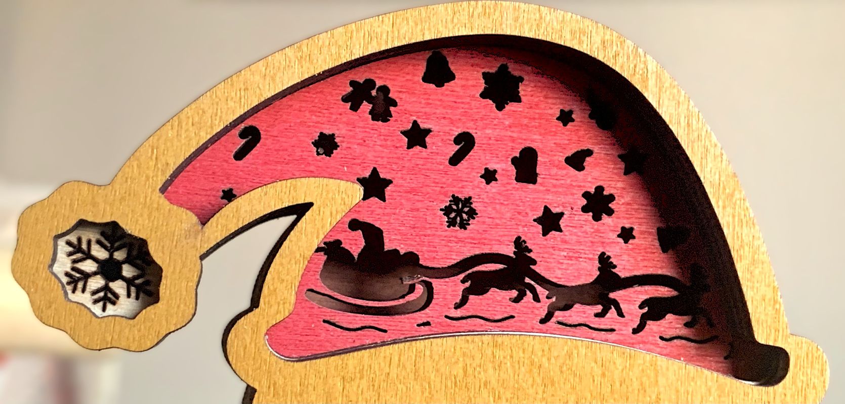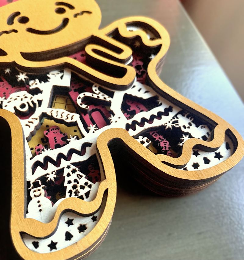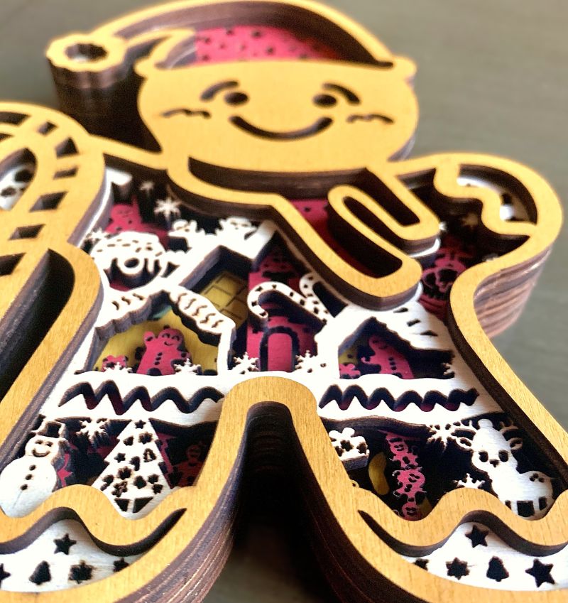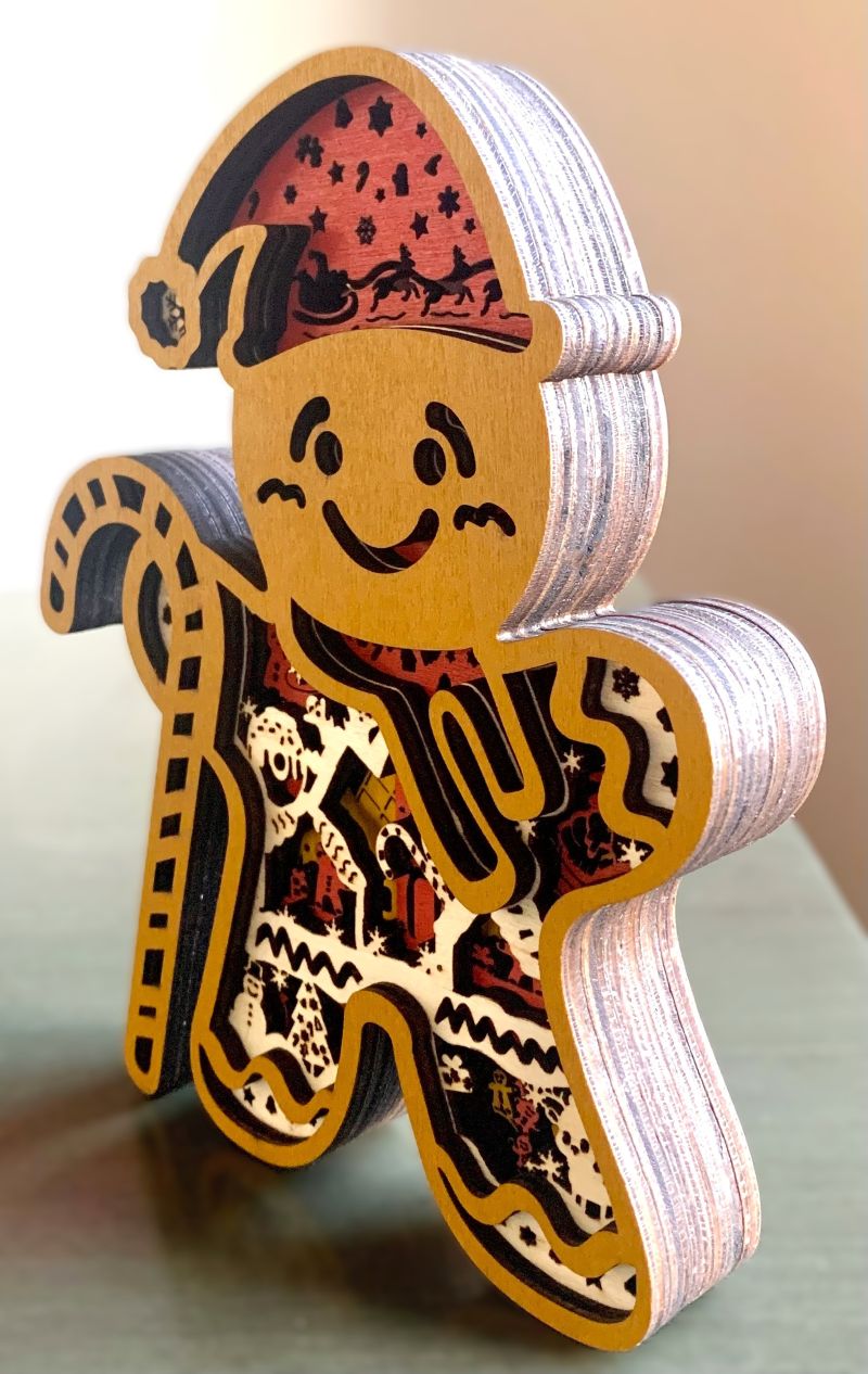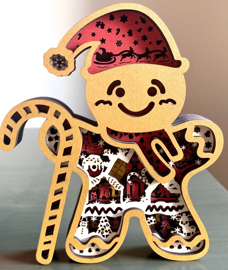 Celebrate the season with this delightful Christmas Wood Diorama, a festive 3D creation that brings holiday magic to life. At its heart stands an endearing gingerbread man proudly displaying a towering candy cane. Discover layers of Christmas wonder within—playful snowmen, galloping reindeer, cheerful gingerbread figures, and a glowing Christmas tree create a miniature winter landscape that captivates the eye. Crowning the display, the gingerbread man's Santa hat reveals an enchanting scene of Saint Nick soaring across the starlit sky with his sleigh team, accompanied by beloved holiday symbols. This charming diorama transforms any space into a festive focal point, whether displayed on a shelf, mantel, or tabletop.