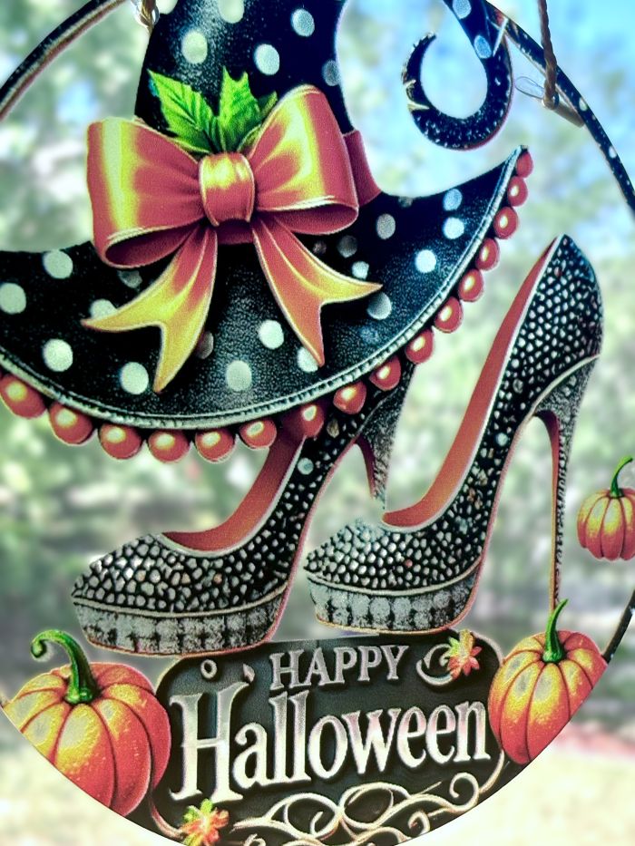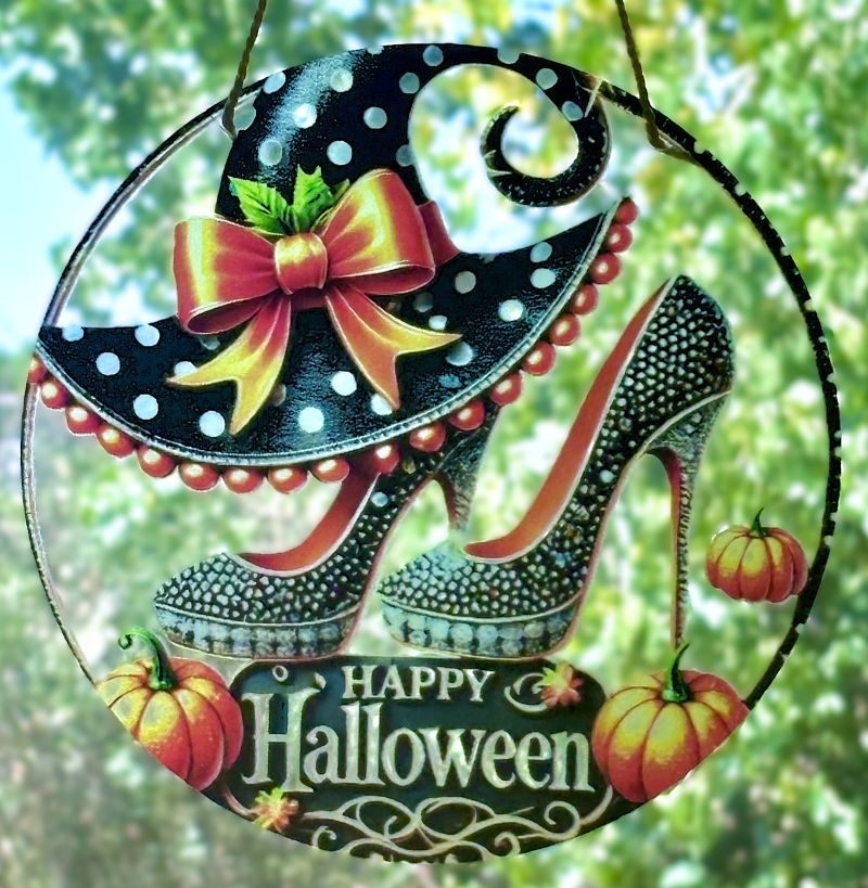Capture the charm of a glamorous witch with this enchanting sun catcher. It showcases a black and white polka dot hat adorned with a vibrant orange bow and a playful curled tip. The witch’s sleek black stilettos feature towering heels, sparkling diamond details, and striking orange highlights. Accented with festive pumpkins and a stylish "Happy Halloween" embellishment, this whimsical piece adds a touch of magic and elegance to your holiday decor.