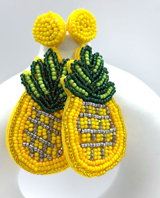 With a thick yellow felt foundation, these earrings are so light you'll forget you're wearing them. With metallic gold , silver, and green accent beads, these pineapples will shine and sparkle in the sunlight.