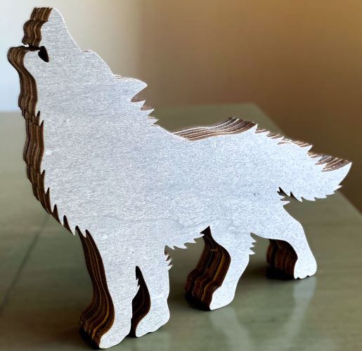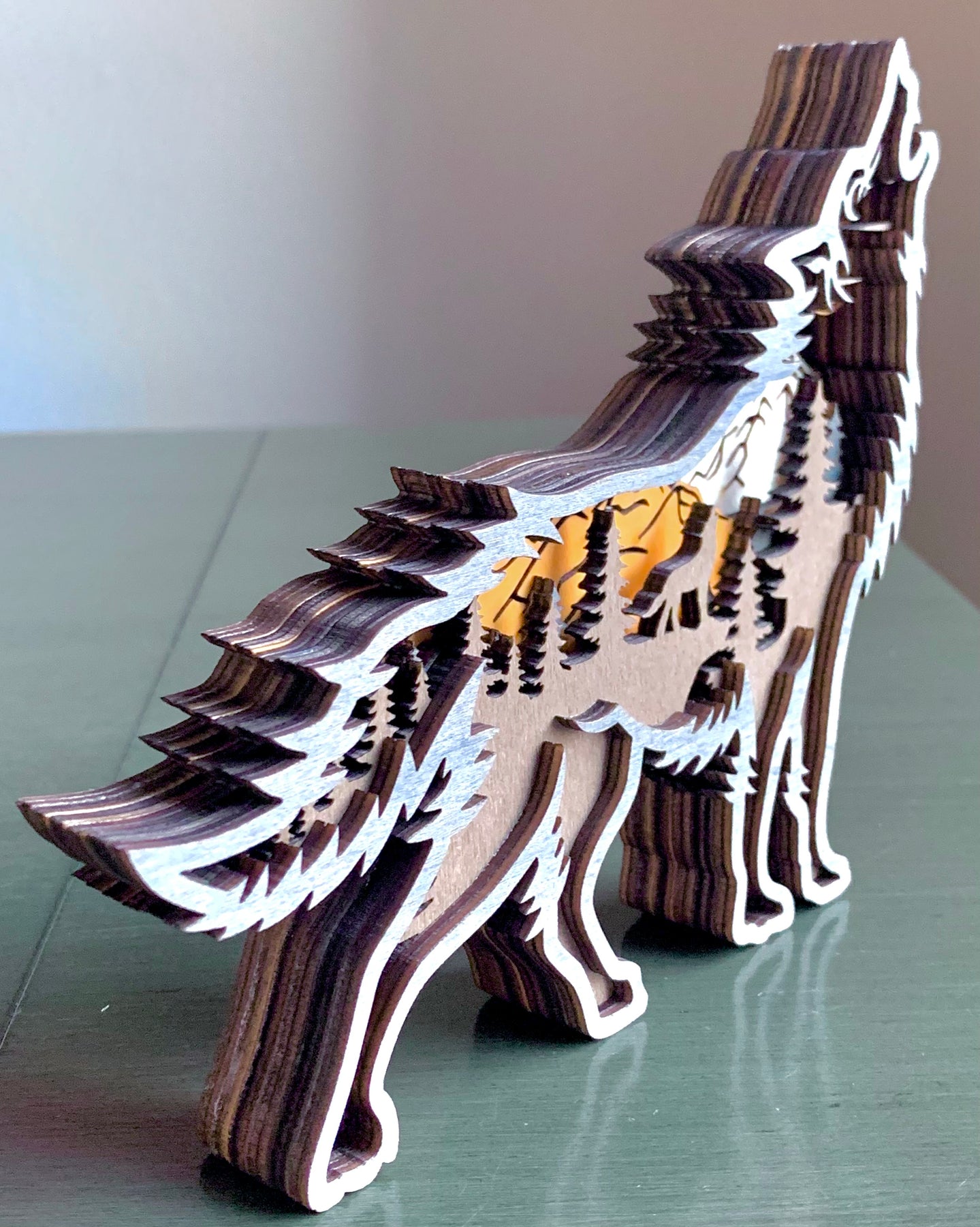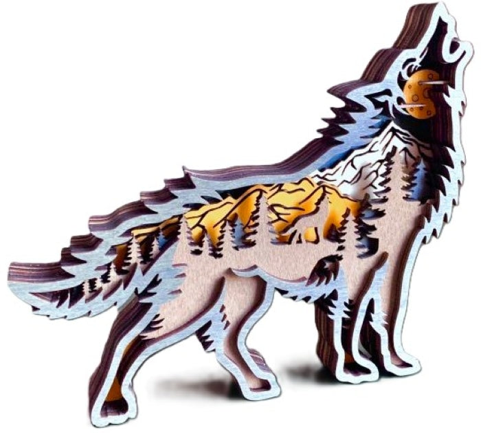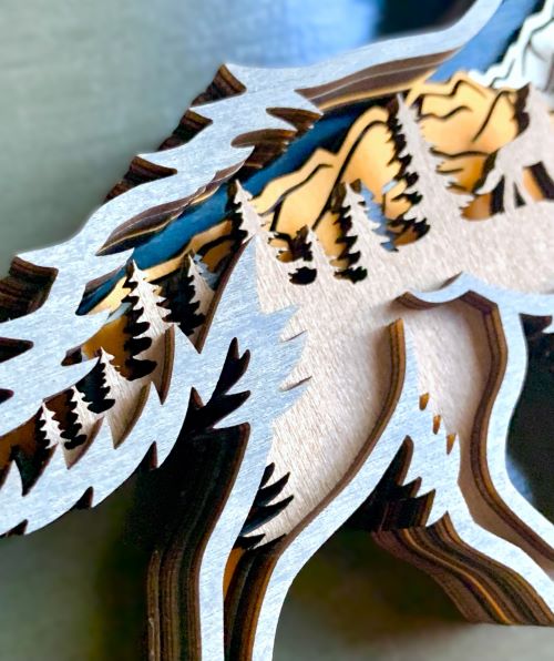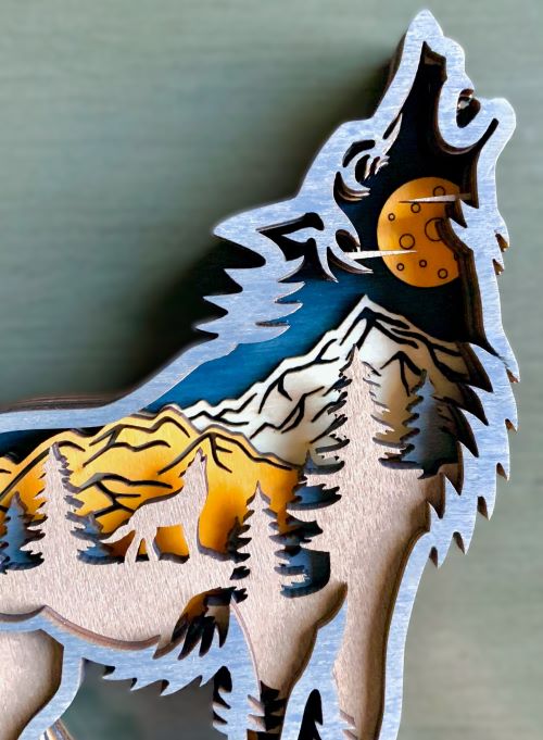 Layers of wood are put together which creates the outside wolf shape. Inside are multilayers of laser-cut stained wood in brown, black, golden orange and natural. Inside the wolf is a very nicely detailed mountain forest scene featuring evergreen trees, a howling wolf, mountains and a full moon.