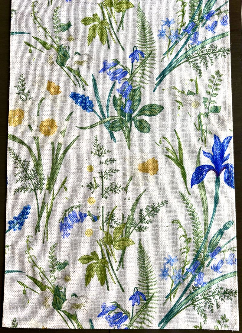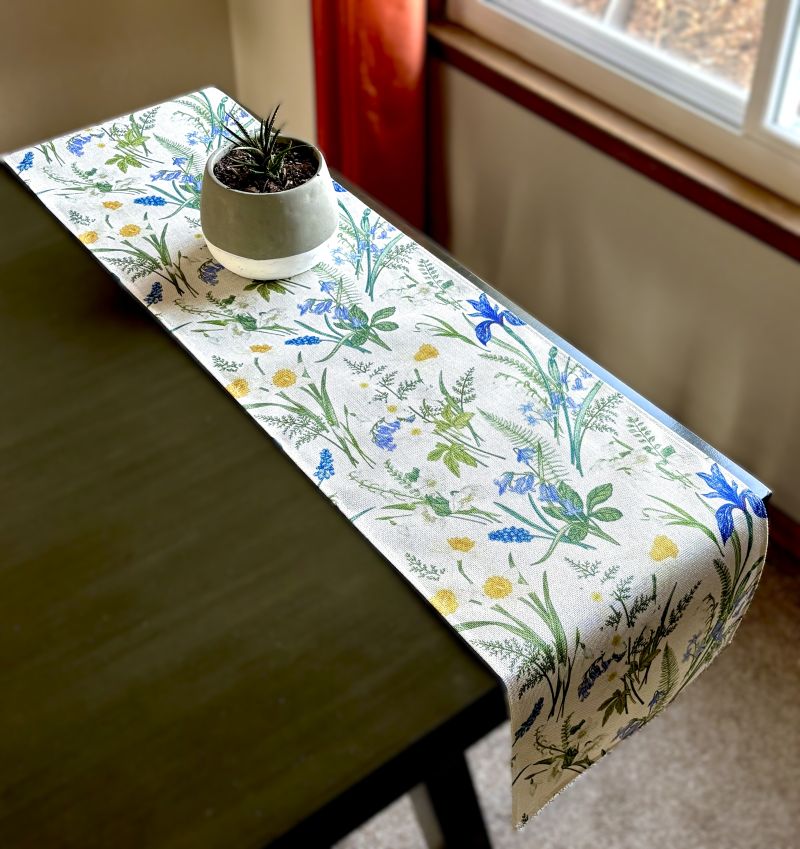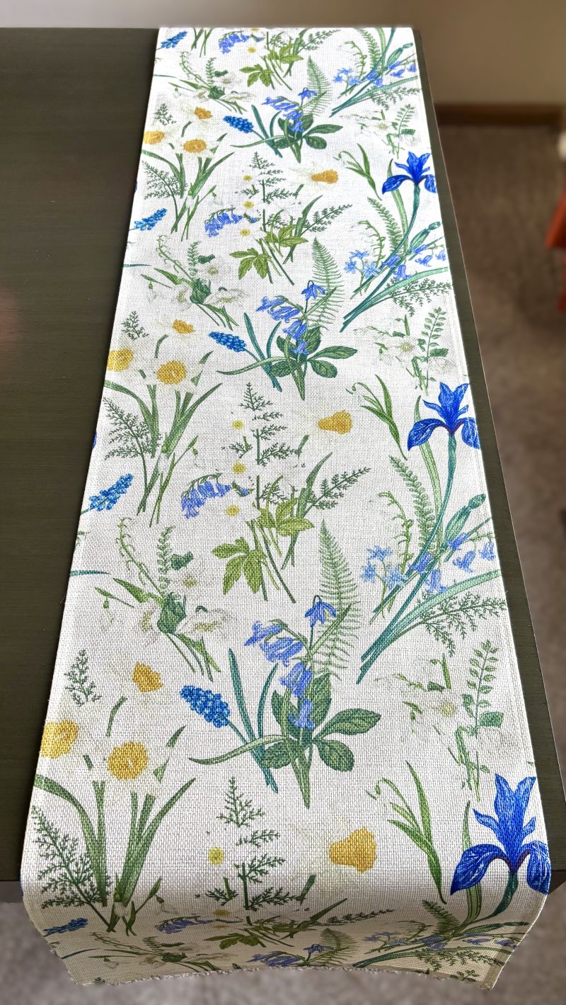 Transform your table into a seasonal showcase with this delightful spring runner. Vibrant iris, daffodil, and bluebells pop against a soft off-white base, complemented by lush green ferns and foliage. Perfect for bringing garden-fresh elegance to your dining space during spring and summer months. This charming piece instantly refreshes any table setting with its botanical appeal and inviting color palette.