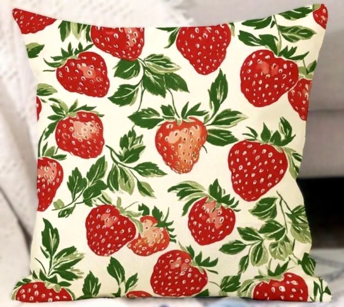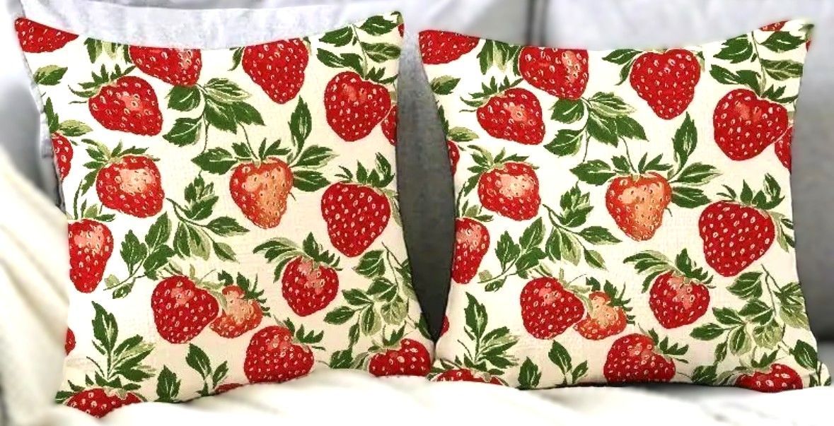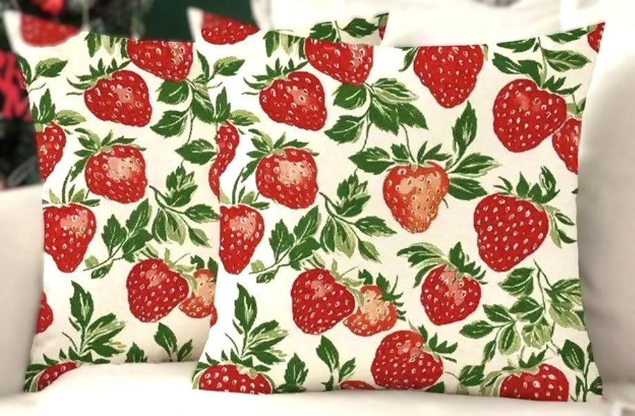 Add a delightful touch to your Farmhouse or Cottage decor with this lovely set of two 18" square pillow covers featuring a fresh strawberry design. The bright red strawberries paired with lively green leaves bring a burst of color and charm to any room.